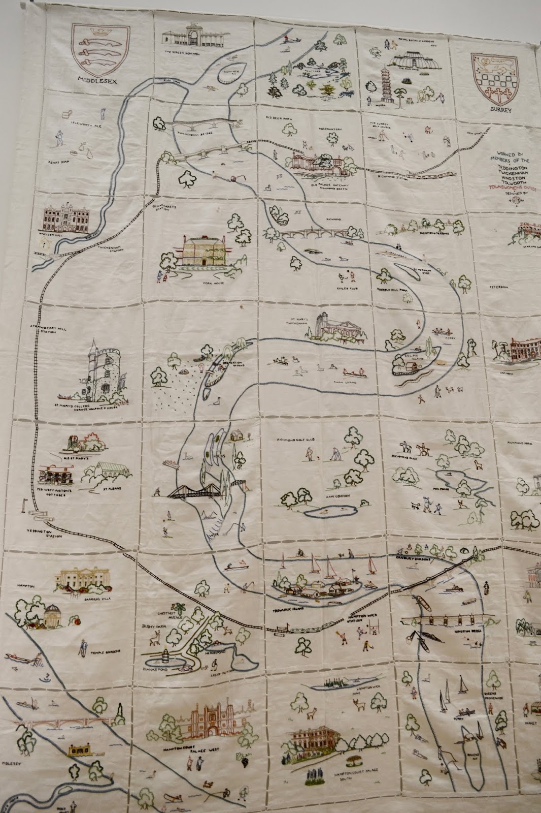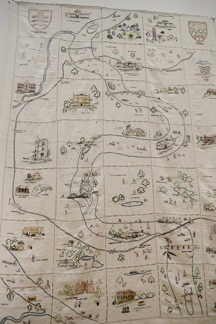 On a recent visit to Orleans House Gallery in Twickenham the work I found most interesting was this embroidery map of my local area. The description says it was made on 35 cotton panels, but looking closely it is clear that these are white handkerchiefs. Perhaps that was all the ladies could get at that time. It was made in 1941 by the members of the Townwomen's Guilds of Teddingston, Twickenham, Kingston and Tolworth for the British Red Cross.